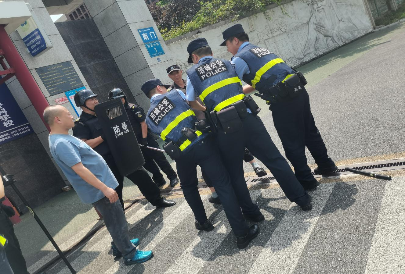 演练正式开始!在校门口,现场模拟突发事件:1名“歹徒”手持凶器闯入校园,校园安保人员发现情况后,立即启动应急预案,校园安保“最小作战单元”快速携带防暴器械赶往现场并形成第一道防线,与“歹徒”展开周旋,阻止其进一步扩大威胁范围。分局指挥中心接警后按照反恐防暴应急处置预案迅速出动警力抵达现场处置。派出所民警与校园安保人员密切配合,利用战术队形对“歹徒”进行包围。经过短暂对峙,民警与安保人员果断出击,用专业防暴技能将“歹徒”成功制服,由派出所民警将其带离现场,整个过程高效稳妥,最大限度地降低了潜在风险,成功化解了危机。整个演练培训过程紧张有序,安保人员反应迅速、处置得当,充分展示了良好的应急处突能力和团队协作精神,达到了预期效果。